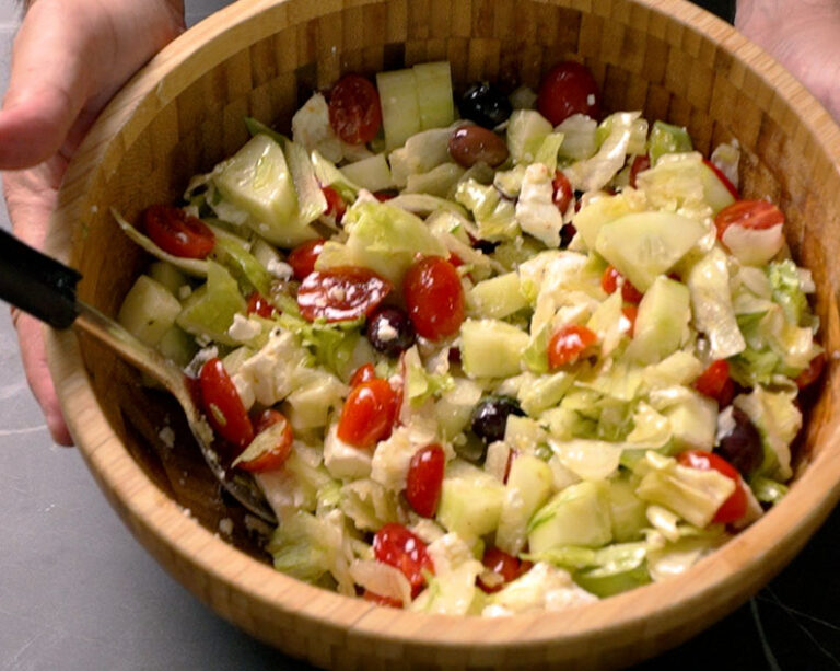 Greek salad Ingredients: 2 larger peppers (red and green) 1 cucumber 1 large red onion 4 larger or 6 smaller