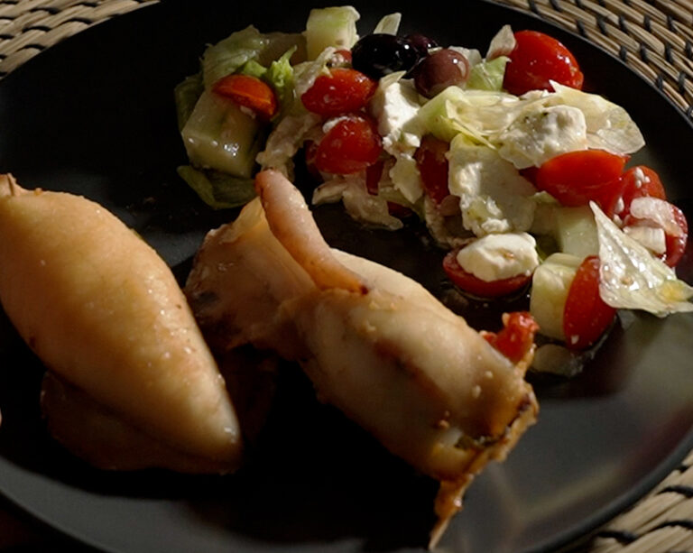 Nikos and Kosta reveal to you the secret of an excellent Mediterranean lunch: stuffed squid with cheese, tomatoes, hot peppers