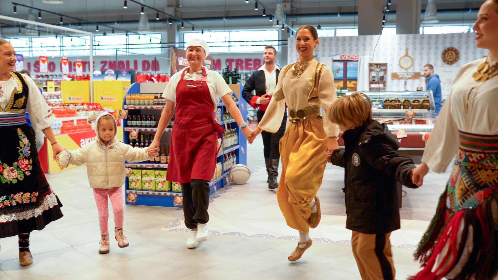 Posebnu pažnju privukao je trenutak kada se kolo spontano zaigralo među rafovima. Uz narodnu muziku krenuli su plesači u narodnim nošnjama, a velikom brzinom se priključili kupci i zaposleni. Pogledajte kako je to izgledalo klikom na link.